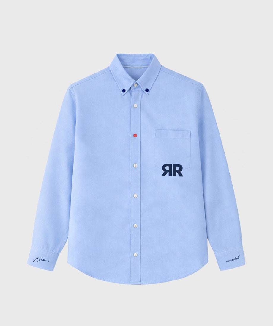 Blue shirt with "RR" embroidery and sleeves with "Perfection is Overrated": It fuses elegance with rebellion, standing out with unique style and a defiant attitude.