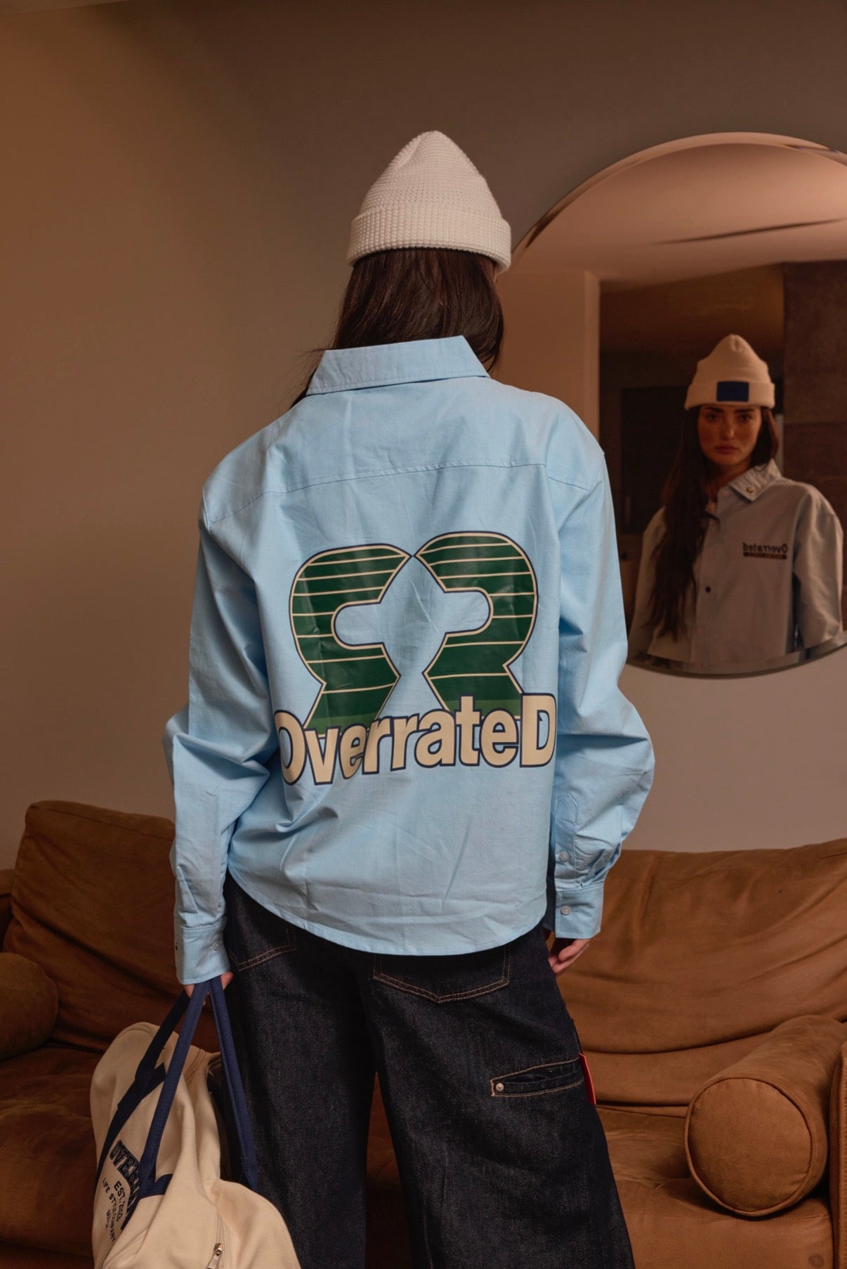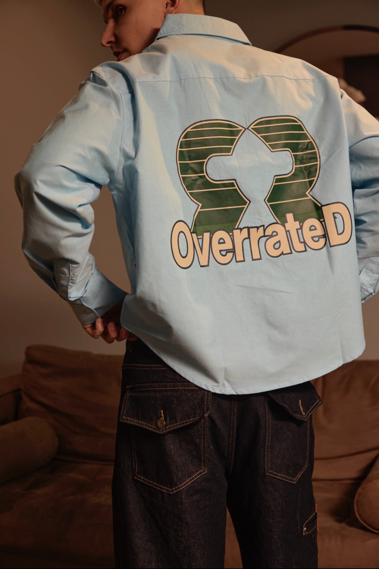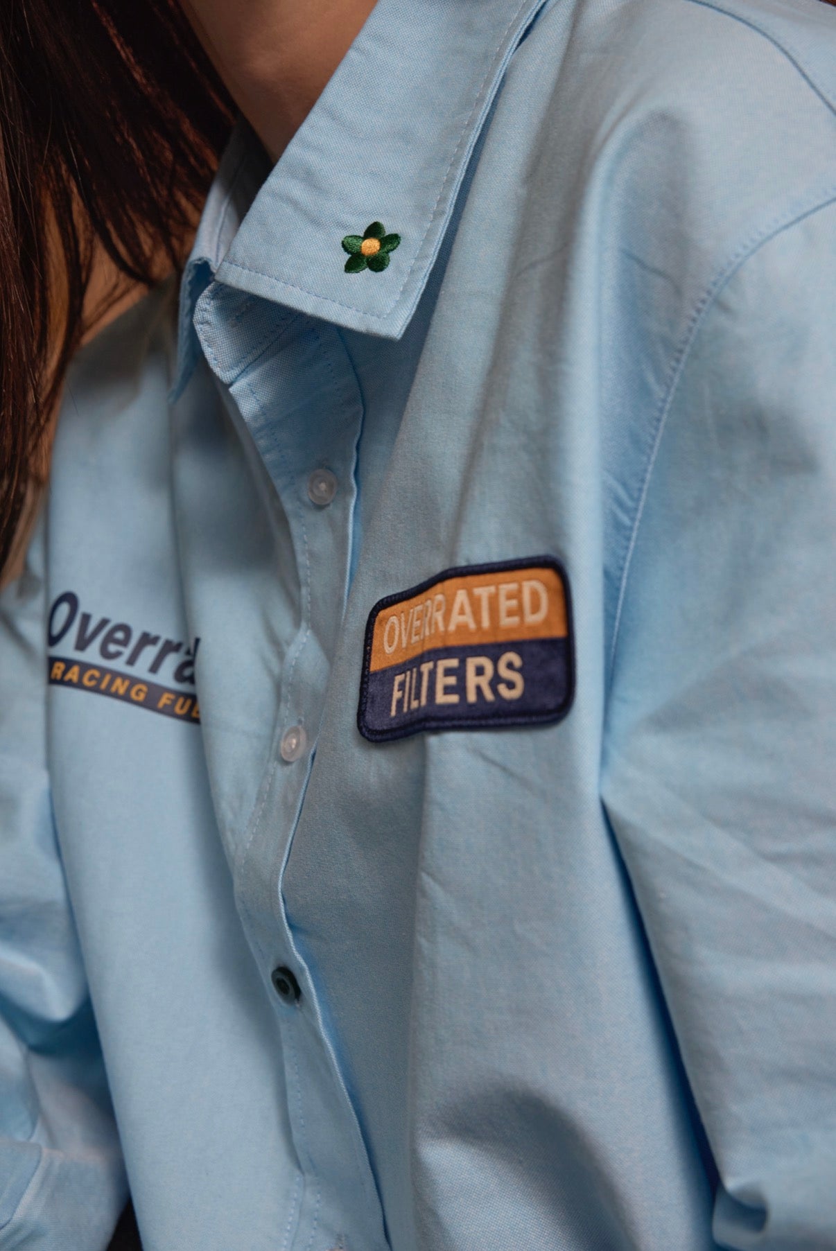Premium cotton shirt in deep blue with a distinctive design. It features an embroidered "overrated filter" patch on the front and "rr overrated" detail on the back for an authentic look. The collar has delicate floral embroidery that adds sophistication to the design. Perfect for those who appreciate garments with character and attention to detail. Comfortable for everyday or casual wear, it combines graphic style with quality finishes.