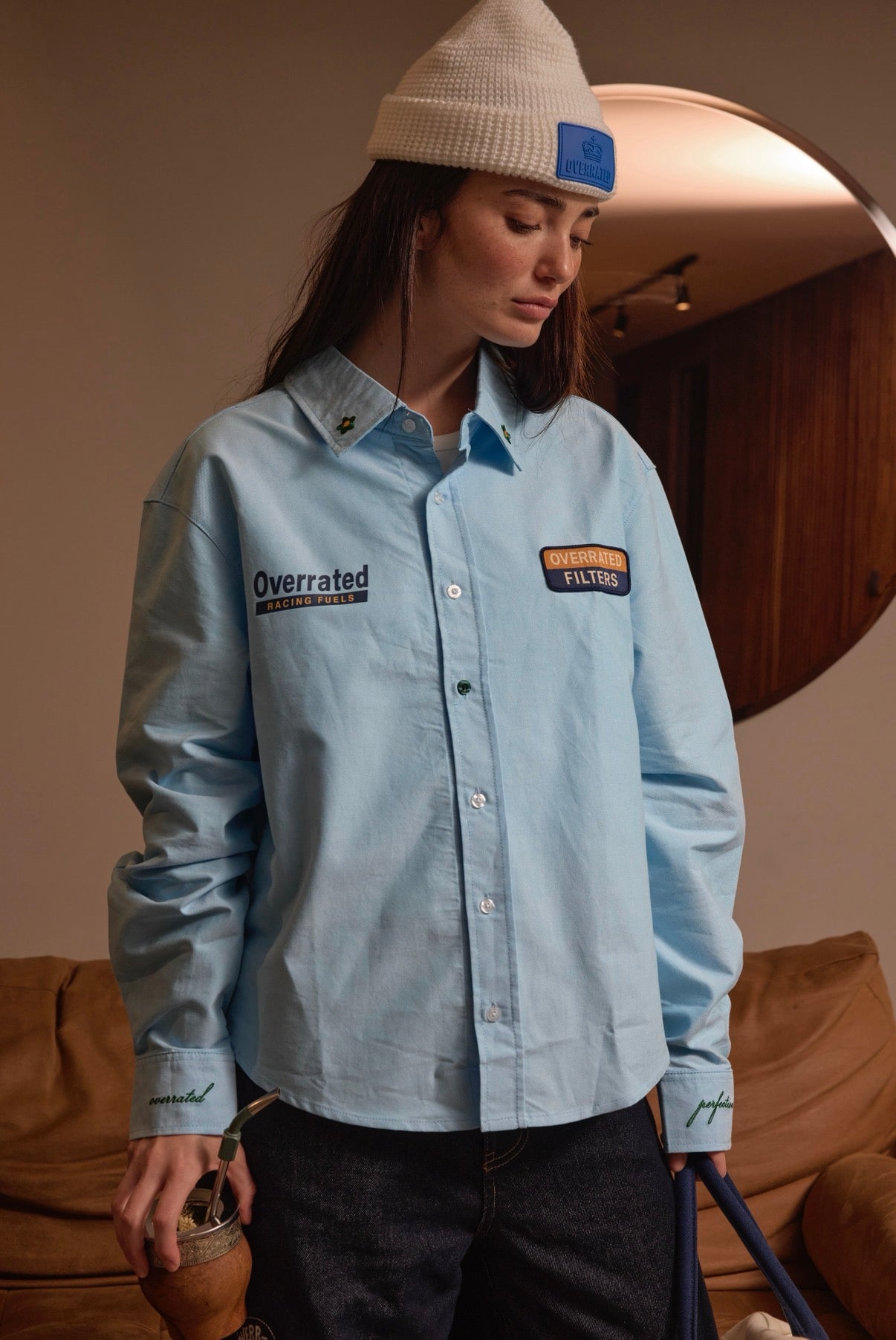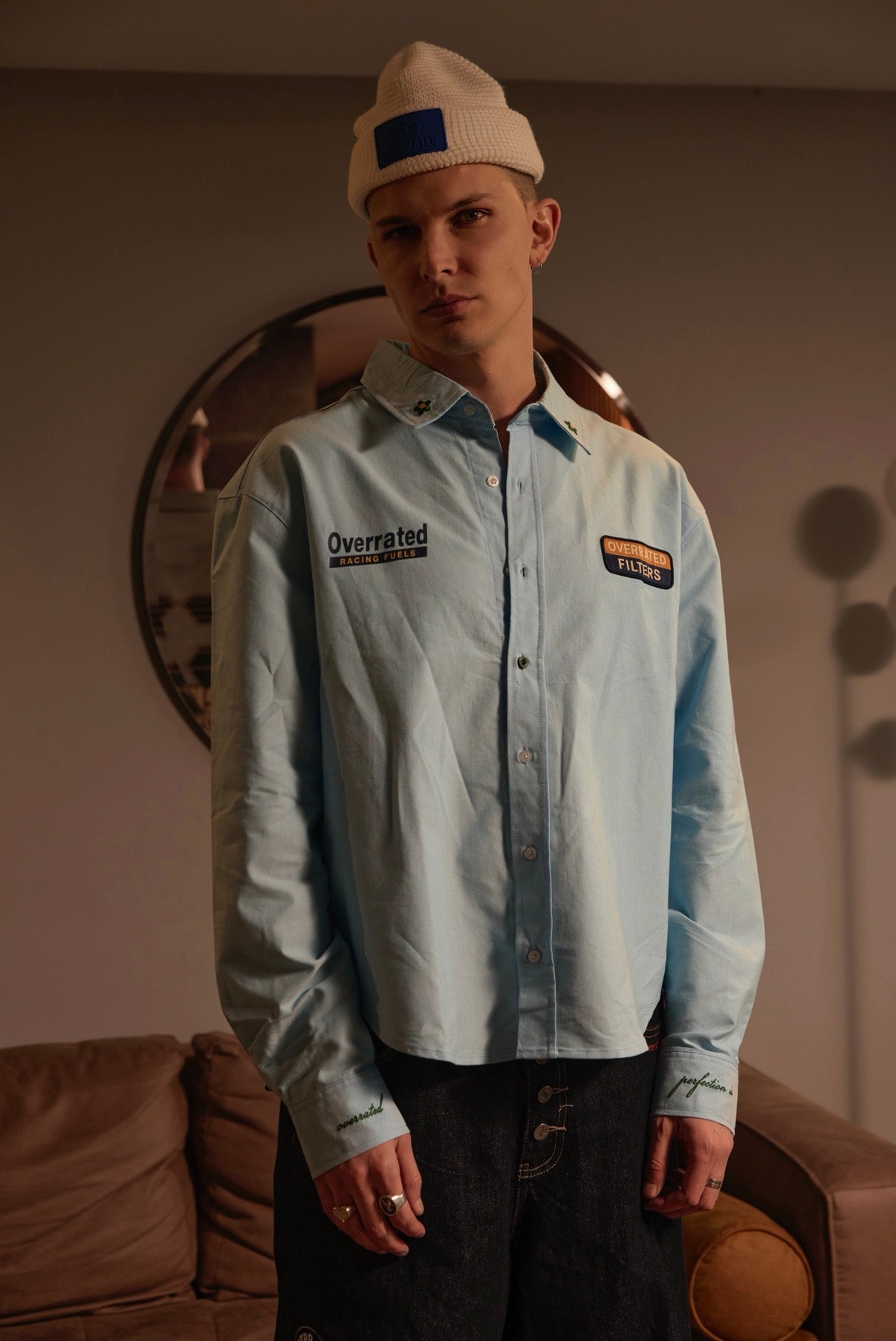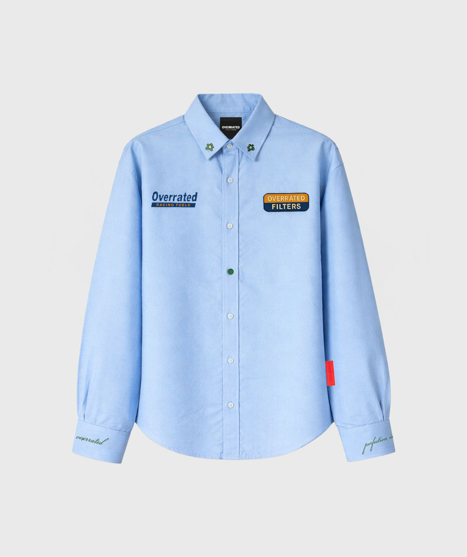 Premium cotton shirt in deep blue with a distinctive design. It features an embroidered "overrated filter" patch on the front and "rr overrated" detail on the back for an authentic look. The collar has delicate floral embroidery that adds sophistication to the design. Perfect for those who appreciate garments with character and attention to detail. Comfortable for everyday or casual wear, it combines graphic style with quality finishes.