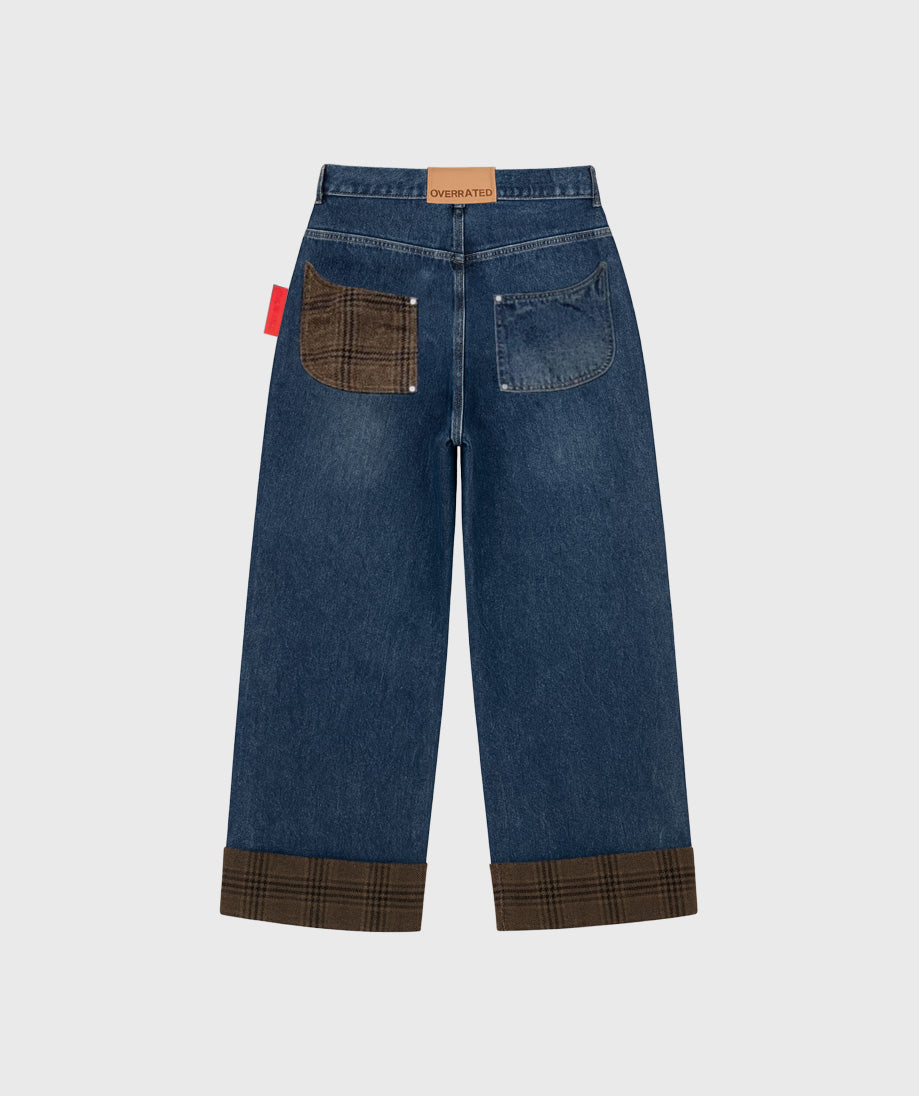 Baggy jeans in a light wash blue combine comfort and contemporary style. They feature plaid wool details at the hem, adding texture and sophistication to your look. The relaxed fit provides freedom of movement, while the brown trim complements the color palette for a versatile and visually striking outfit. Perfect for those seeking pieces that balance trendiness and practicality.