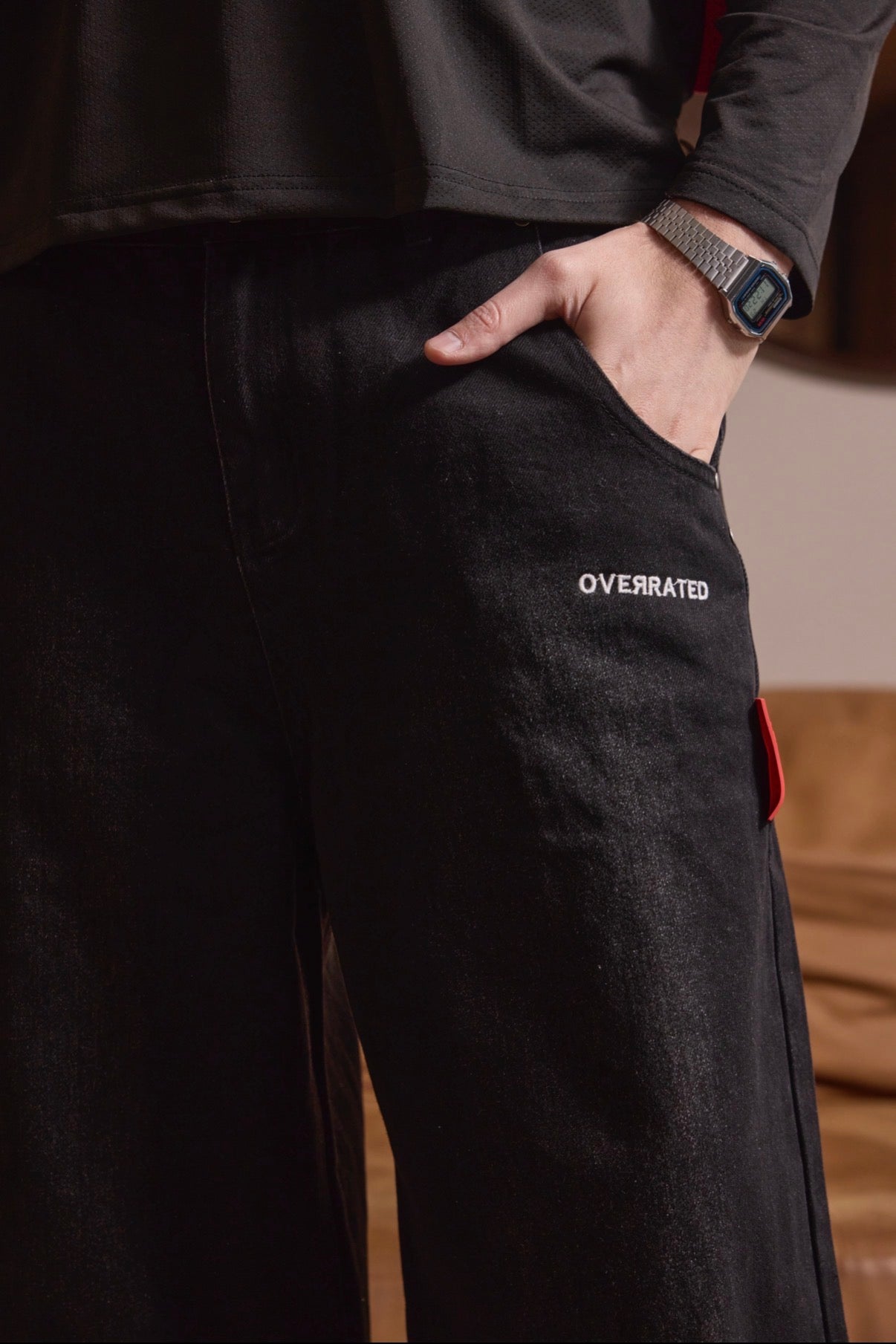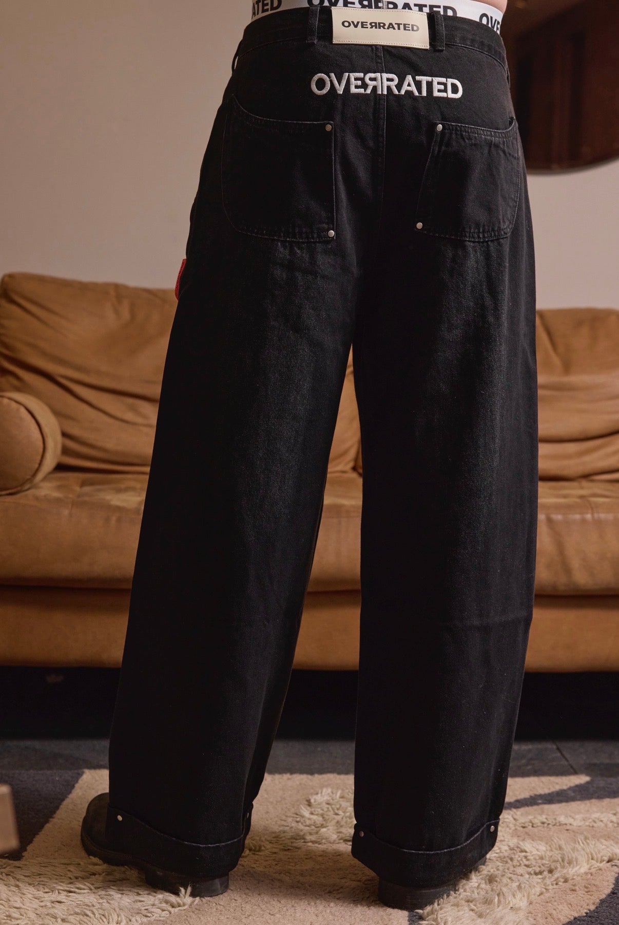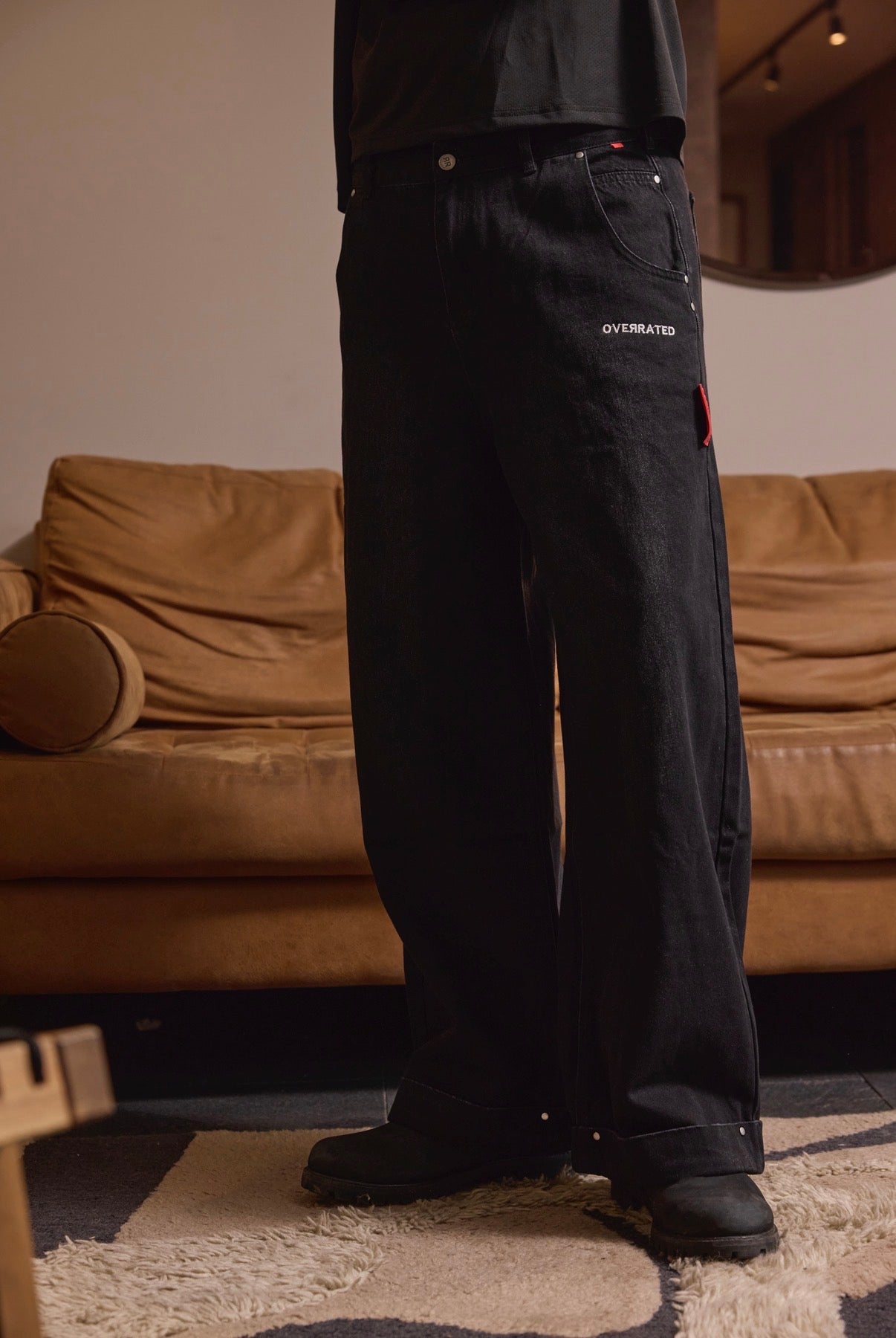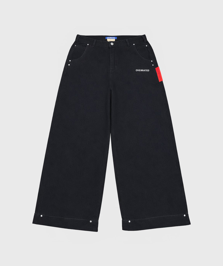 Baggy jeans in faded black that combine comfort and urban style. Designed with strategically placed rivets that add an industrial touch and personality to the look. The distressed fabric creates an authentic vintage finish, while the relaxed fit allows freedom of movement without compromising the silhouette. Perfect for those looking for a versatile garment that works for both casual and streetwear looks.