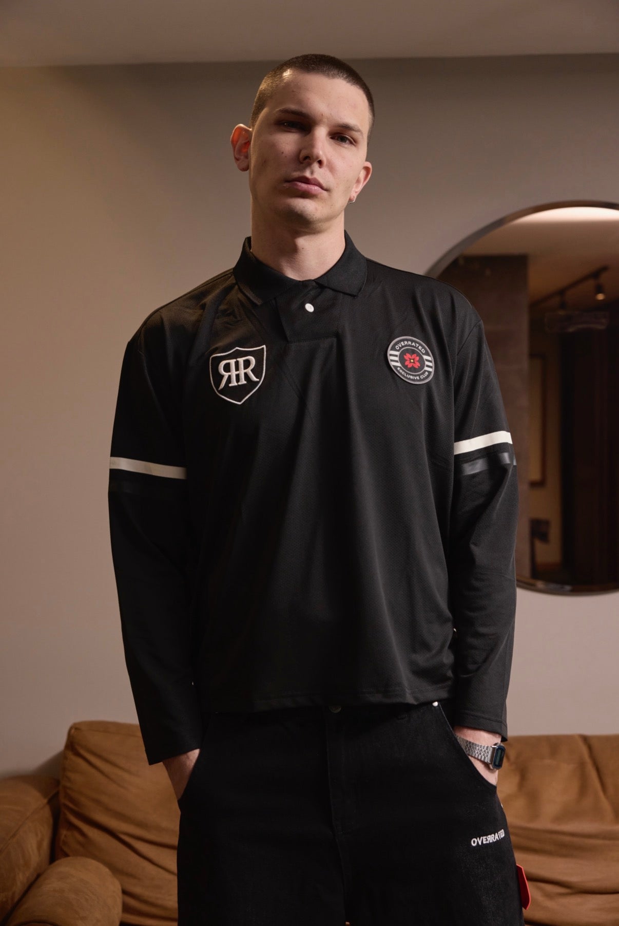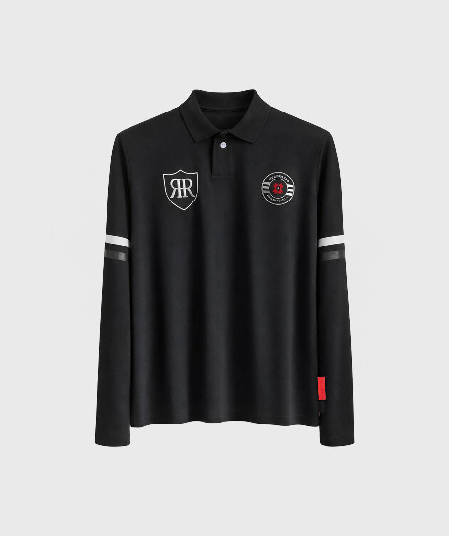 Premium cotton polo shirt with a unique design and long sleeves. Made from high-quality cotton fabric that offers comfort and durability with every wear. It features a distinctive club patch that adds a sophisticated and unique touch. The classic polo cut and long sleeves make it versatile for various occasions, from casual to semi-formal. Available in black, a timeless color that complements any wardrobe. Ideal for those seeking quality garments with character.