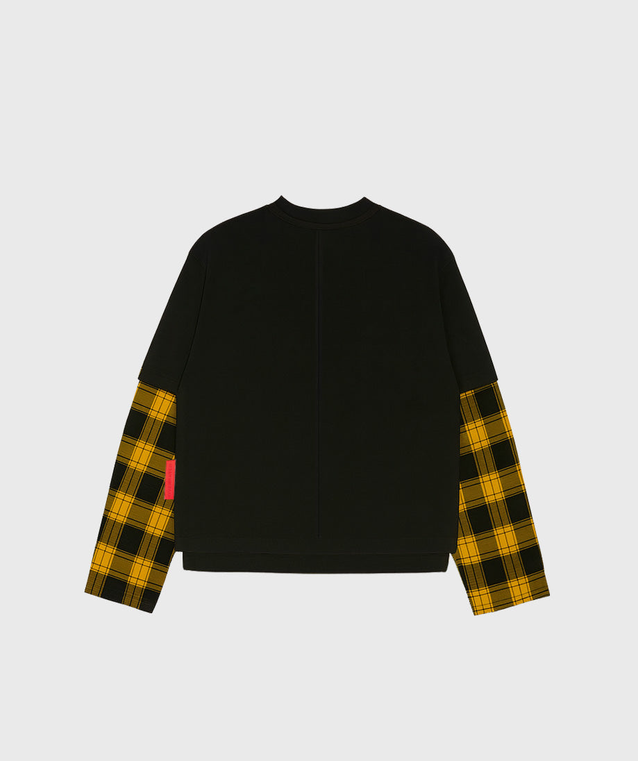 The Overrated Black Basic Plaid T-Shirt combines urban style with unique details, including its yellow plaid sleeves....